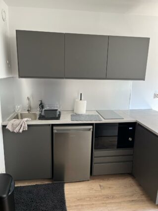 Cuisine neuve entièrement équipée : plaques induction, four et micro onde combiné, frigo, aspirateur, nombreux rangements, bar repas avec chaises hautes,